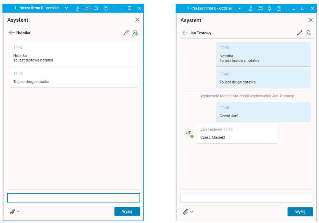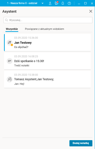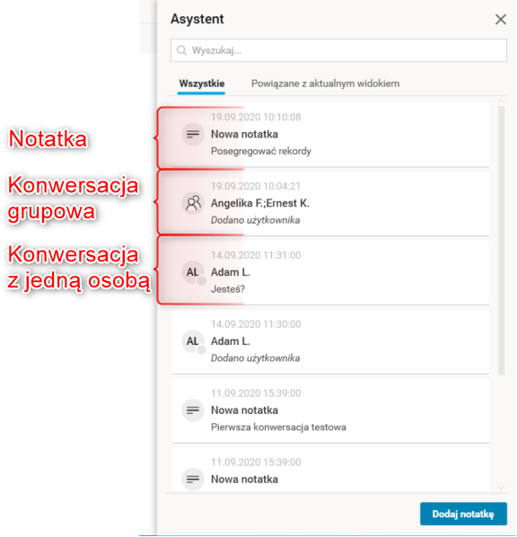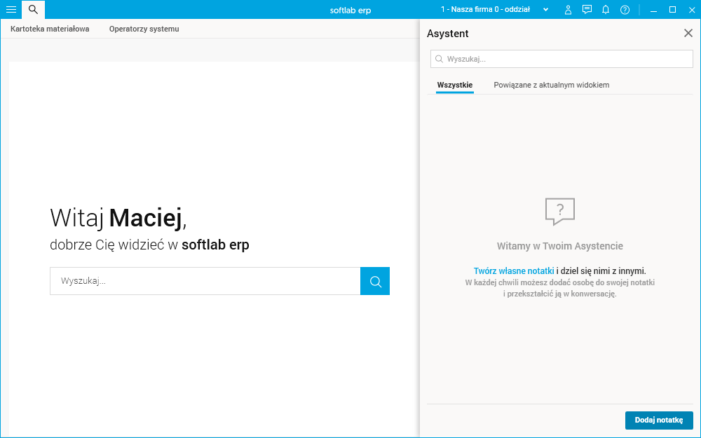 Na ekranie głównym panelu Asystenta widzimy sporządzone przez nas notatki lub konwersacje z innymi operatorami. Z tego poziomu możemy również tworzyć nowe notatki, do których następnie możemy zaprosić innych użytkowników tworząc konwersację (czat).