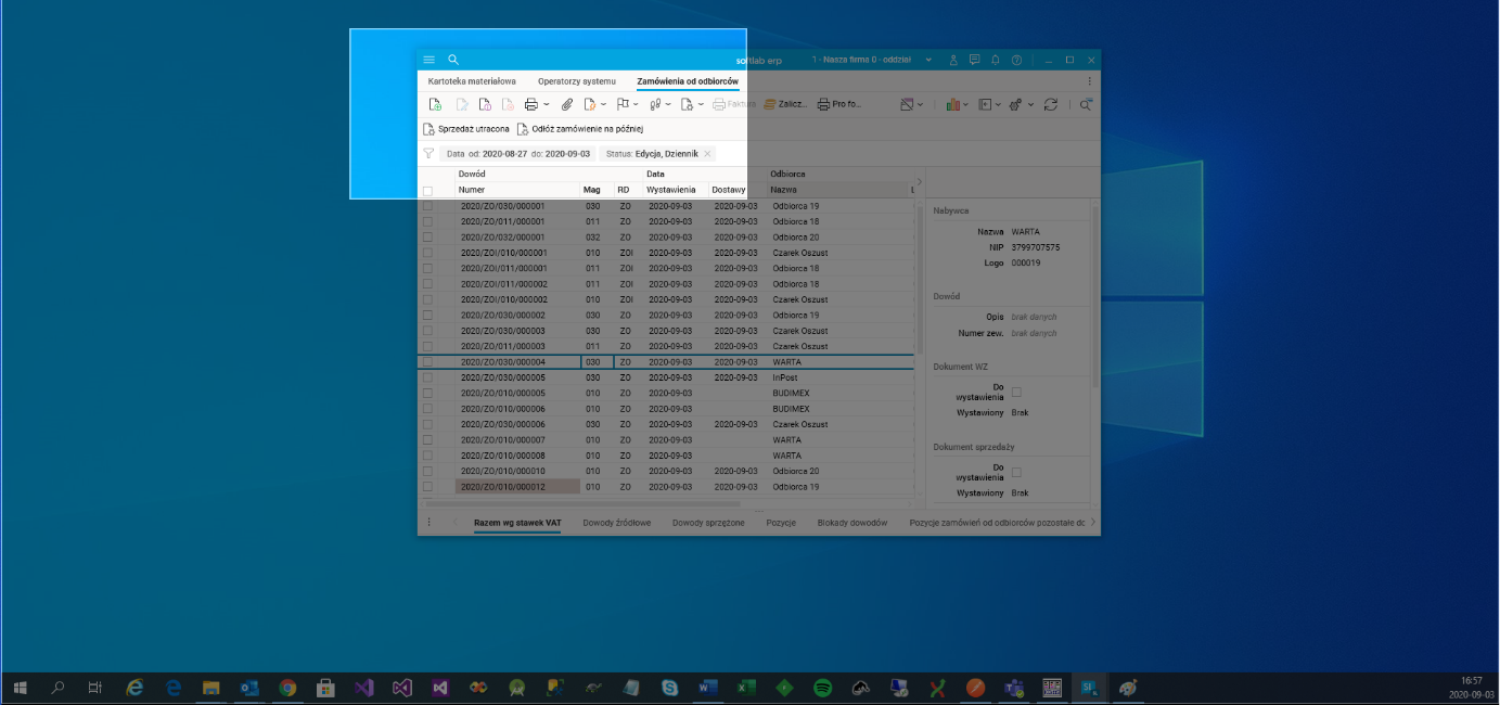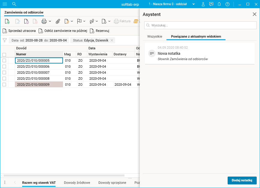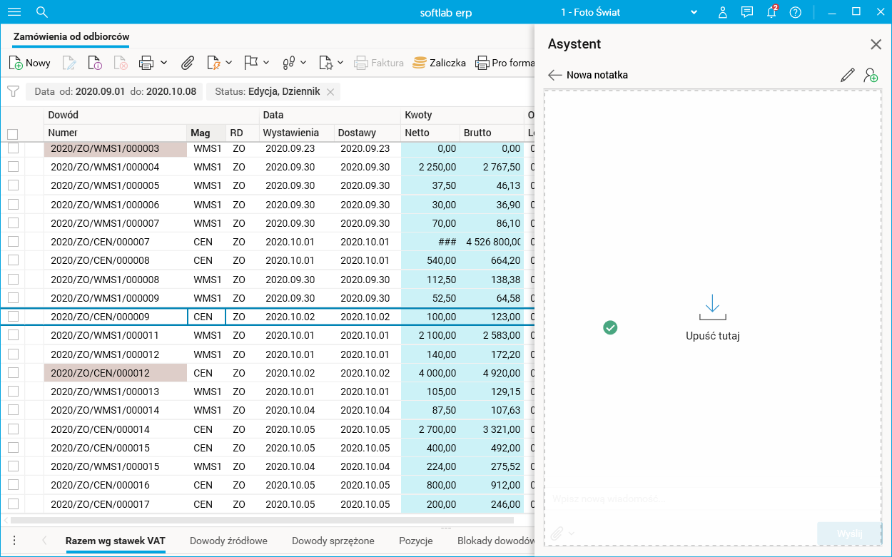 Asystenta ERP można włączyć przyciskiem Asystent prawym górnym rogu aplikacji.