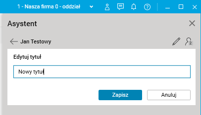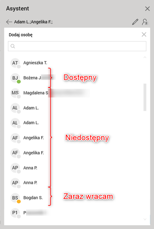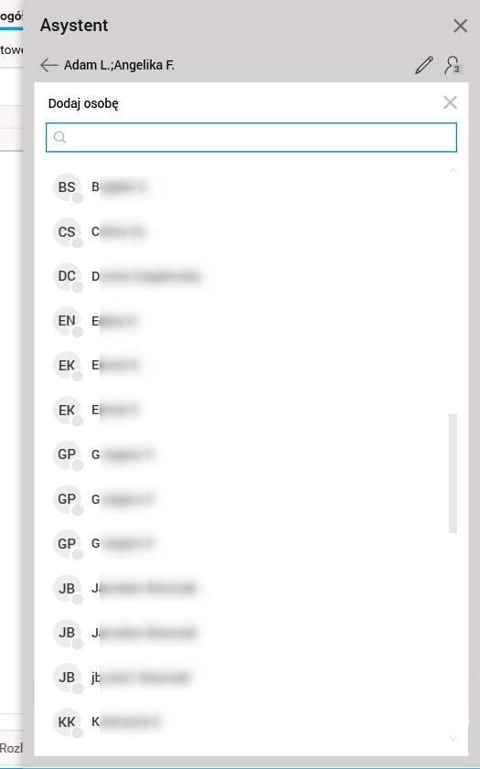 Użytkownika do notatki/konwersacji zapraszamy, korzystając z przycisku Dodaj użytkownika do notatki w prawym górnym rogu Asystenta. Po jego kliknięciu ukaże nam się lista użytkowników wraz ze statusami aktualnej obecności. Użytkownika dodajemy poprzez dwukrotne kliknięcie (dwuklik).
