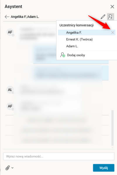 Twórca konwersacji może usunąć dodanych przez siebie użytkowników, klikając przycisk X widoczny przy nazwisku użytkownika.