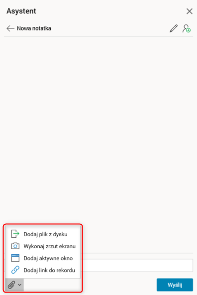 Zrzut ekranu tworzymy za pomocą opcji Wykonaj zrzut ekranu dostępnej w menu załączników w panelu Asystenta.