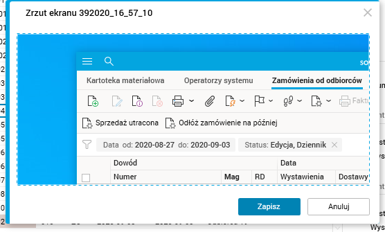 Po zaznaczeniu odpowiedniego fragmentu ekranu mamy możliwość zapisania lub anulowania wybranego wycinka. Zapisanie spowoduje dodanie wyciętego fragmentu ekranu do konwersacji.