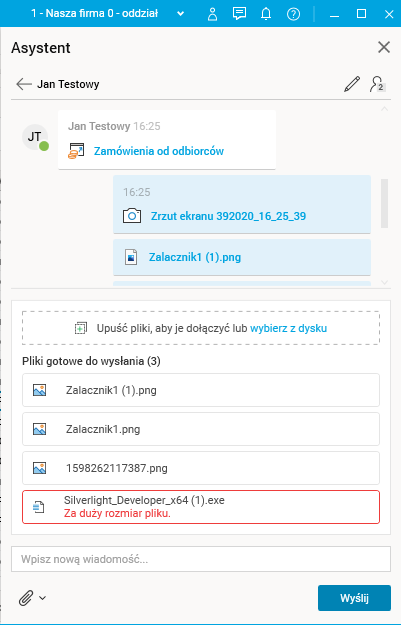Do konwersacji lub notatki możemy dodać pliki, przeciągając je bezpośrednio z Eksploratora Windows lub dodając je z dysku urządzenia za pomocą opcji Dodaj plik z dysku dostępnej w menu załączników.