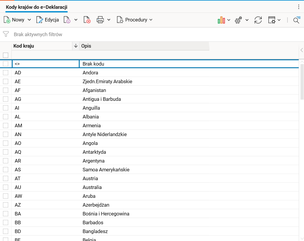 Rys. 4. Słownik krajów, dostępne kody e-deklaracji dla kraju