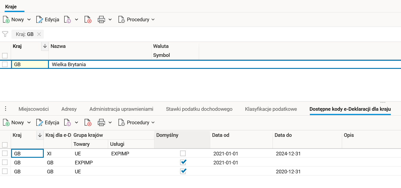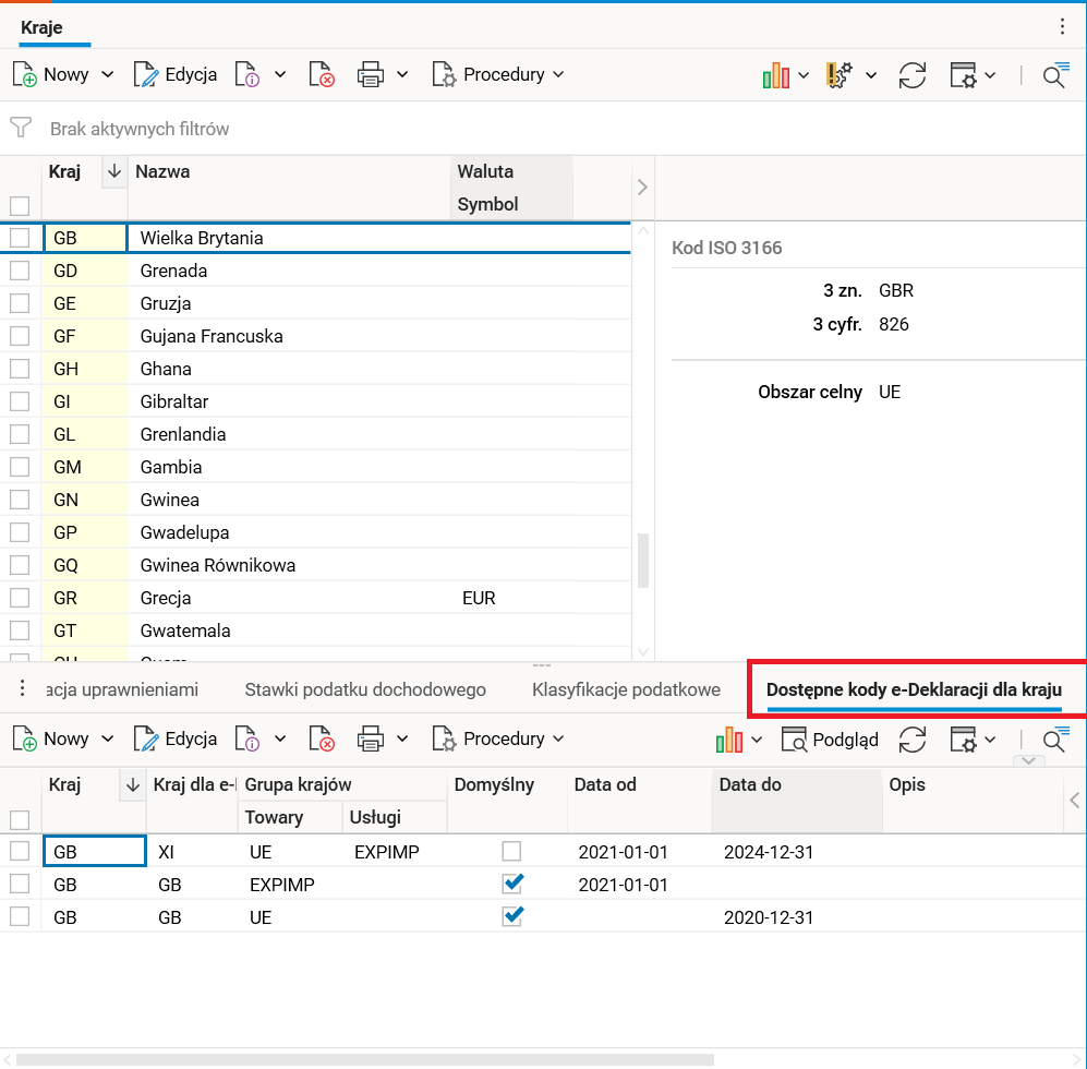 - (Klient) Słownik Kraje – można zmienić obszar celny dla GB z UE na EXPIMP, ale nie jest to konieczne.