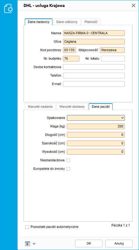 rys. Integracja wysyłki kurierskiej przez Web Serwis z firmą DHL – formularz wprowadzania parametrów przesyłki dla usługi Krajowa