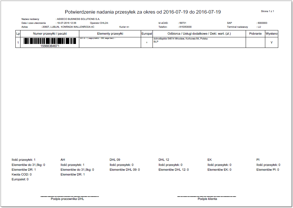 • Zbiorczy dokument nadania, inaczej zwany w systemie DHL raportem PNP (Potwierdzenie Nadania Przesyłek) – grupuje przesyłki z danego dnia, plik pobierany jest w formacie *.pdf.