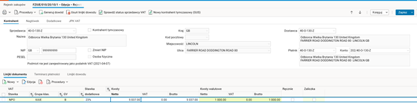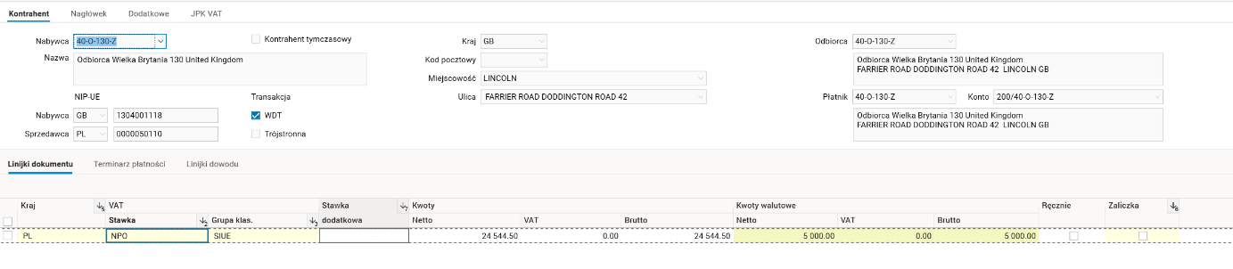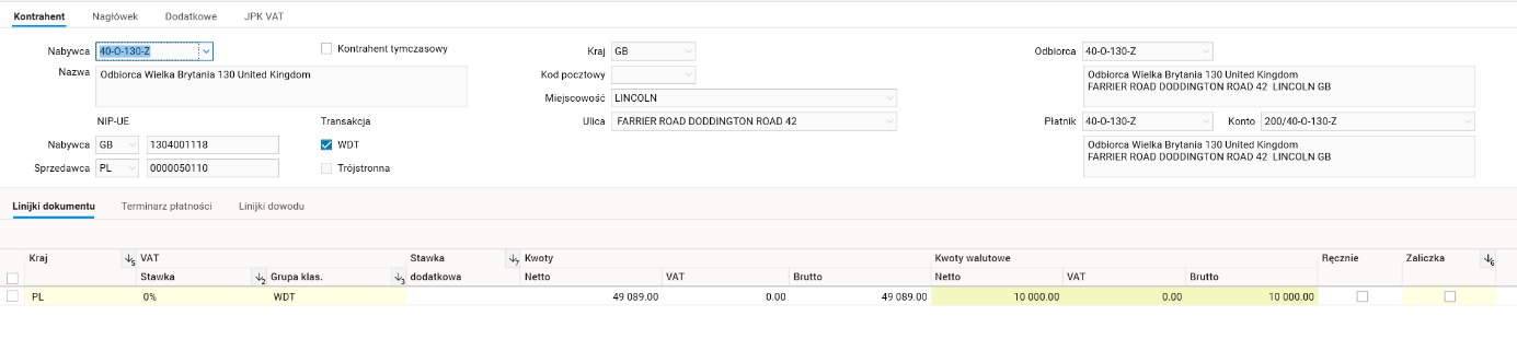 Dostawa towarów do odbiorcy 40-O-130-Z miała miejsce w październiku 2020 r. – operacja była zakwalifikowana jako wewnątrzwspólnotowa dostawa towarów. Kontrahent posłużył się numerem NIP-UE GB1304001118. Faktura wystawiona kontrahentowi została zarejestrowana w rejestrze WDT.