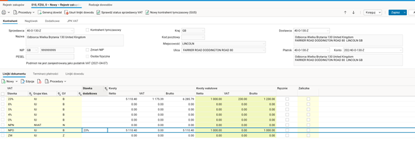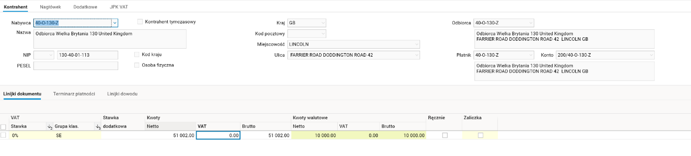 Kontrahent 40-O-130-Z wystawił w październiku 2020 r. fakturę za usługę doradczą dla polskiego przedsiębiorcy. Faktura zawierała NIP UE nabywcy. Usługa wykonana podlegała opodatkowaniu w Polsce i była zakwalifikowana jako wewnątrzwspólnotowe nabycie usług. Dostawca usługi (brytyjski kontrahent) wystawił fakturę na kwotę netto (stawka VAT NP) dodając adnotację, że VAT rozlicza nabywca usługi (VAT reverse charge).