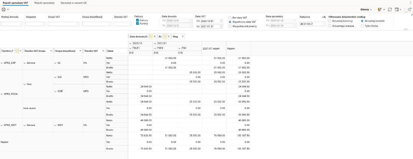 Rys. 2. Dokument z 2021.01 – sprzedaż eksportowa, rodzaj dowodu FSEX w rejestrze SPRZ