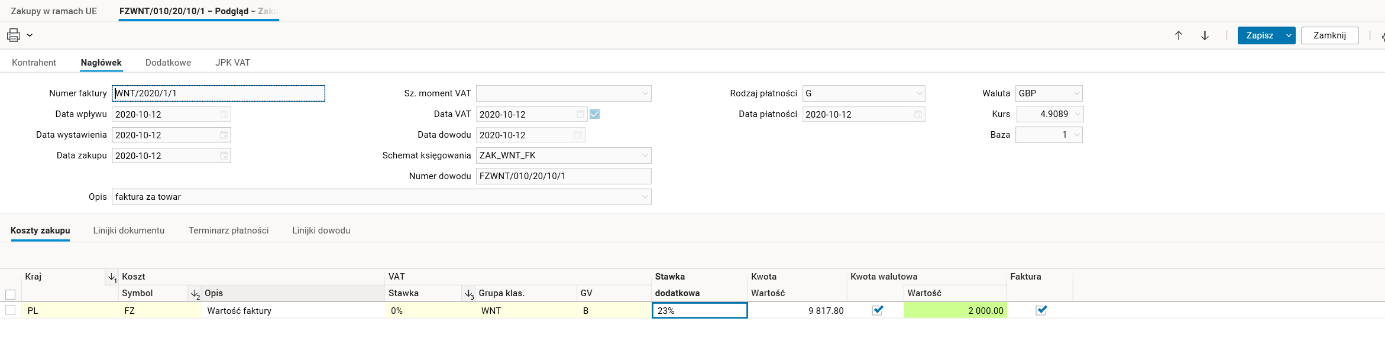 Rys. 6. Dokument z 2020.10 – transakcja WNT, rodzaj dowodu FZWNT w rejestrze WNT