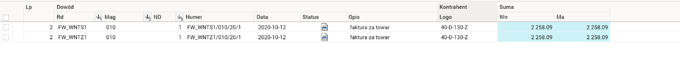 Dla rozliczenia podatku VAT naliczonego i należnego zostały wygenerowane dokumenty wewnętrzne FW_WNTZ oraz FW_WNTS.
