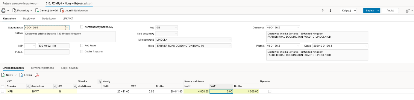 Przykład 3. Nabycie towarów od dostawcy 40-D-130-Z (UK)