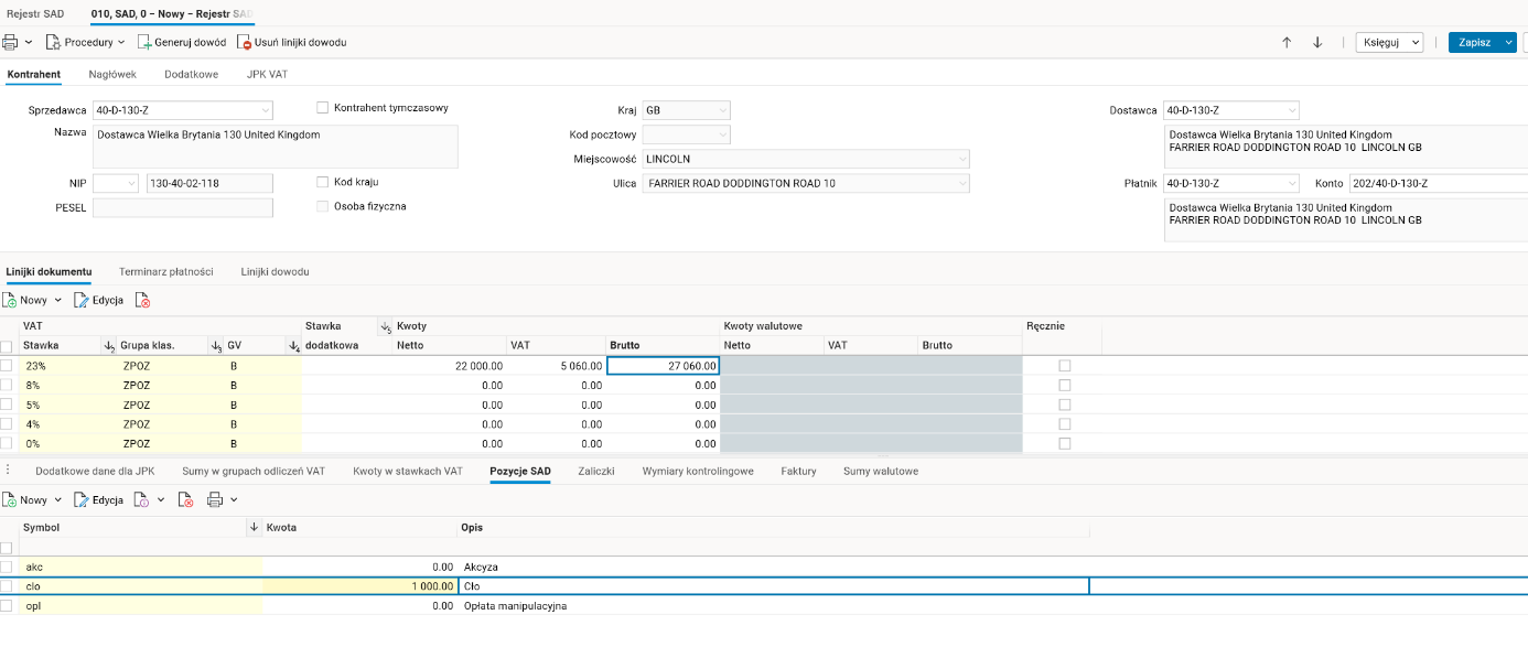 Nabycie towarów od dostawcy 40-D-130-Z w styczniu 2021 r. będzie podlegało już procedurze celnej. Operacja będzie zakwalifikowana jako import towarów. Zmieni się sposób rejestrowania, faktura od dostawcy będzie rejestrowana w rejestrze WNT, dokument celny w rejestrze SAD. Zamiast grupy klasyfikacji WNT trzeba będzie zastosować grupę IT (import towarów). Dokument będzie podlegał oznaczeniu symbolem IMP na potrzeby JPK VAT.