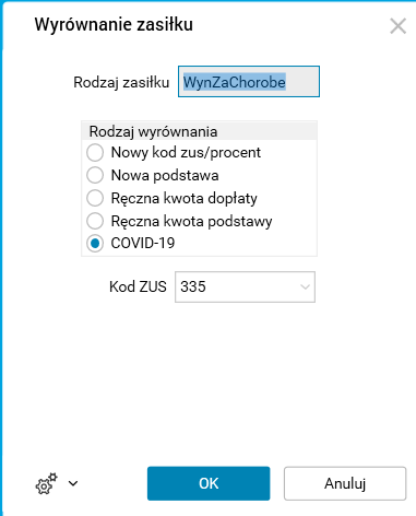 W celu implementacji powyższych przepisów w procedurze Wyrównanie zasiłku, dostępnej w szczególe Zasiłki oraz wynagrodzenie za czas choroby słownika Pracownicy – umowy(etaty) został dodany nowy Rodzaj wyrównania: COVID-19.