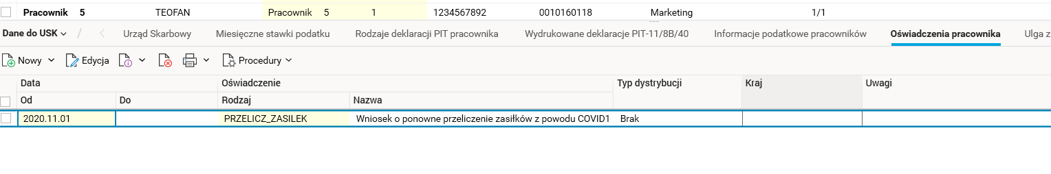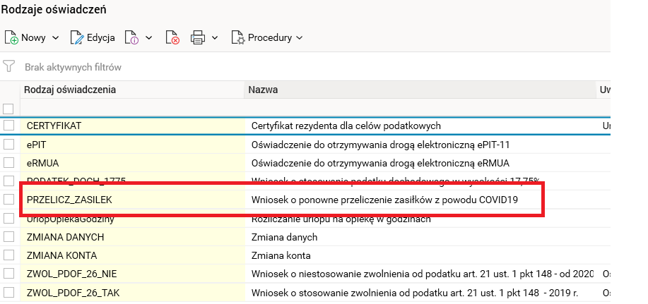 Ponadto dodano nowy rodzaj oświadczenia pracownika / wniosku PRZELICZ_ZASILEK, czyli Wniosek o ponowne przeliczenie zasiłków z powodu COVID19 w słowniku Rodzaje oświadczeń.