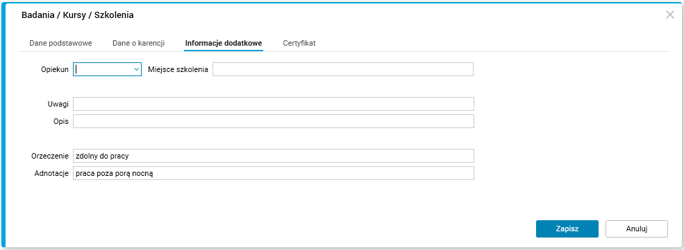 Rys. Okno edycyjne szczegółu Badania /Kursy / Szkolenia w słowniku Pracownicy – umowy(etaty), zakładka Informacje dodatkowe
