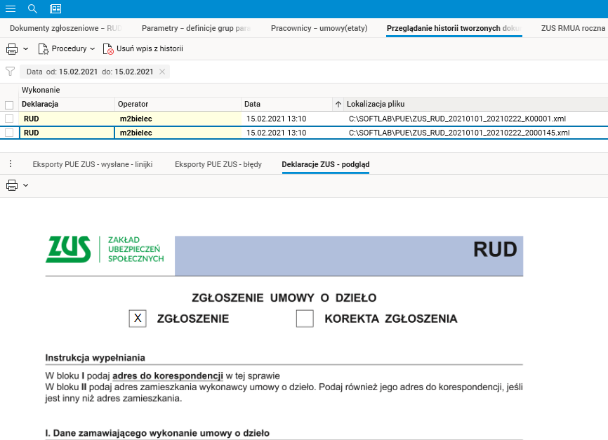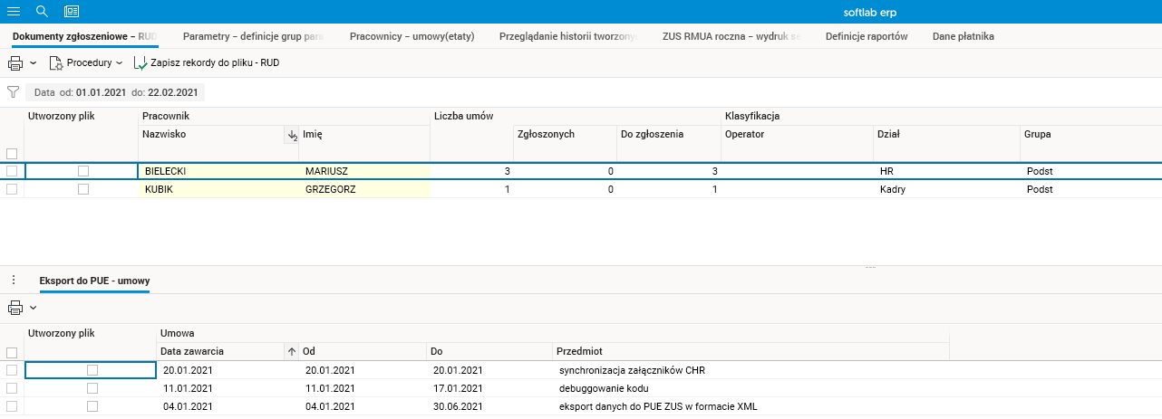 Nowy słownik Dokumenty zgłoszeniowe – RUD pełni funkcję przeglądarki, w której widoczne są osoby, z którymi w określonym przedziale czasu została zawarta umowa o dzieło.