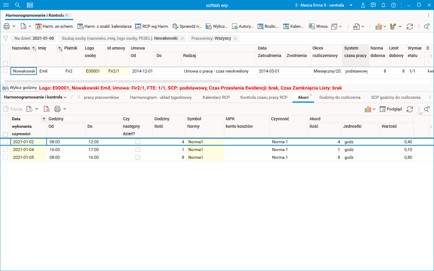 Rys. Słownik Harmonogramowanie i Kontrola RCP – szczegół Godziny do rozliczenia, wyliczone godziny z podziałem na akordowe i nieakordowe