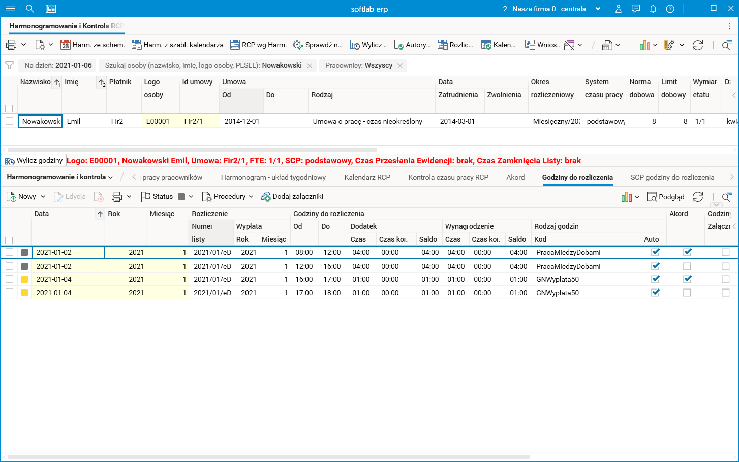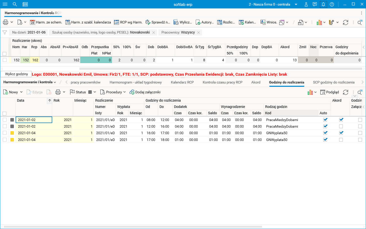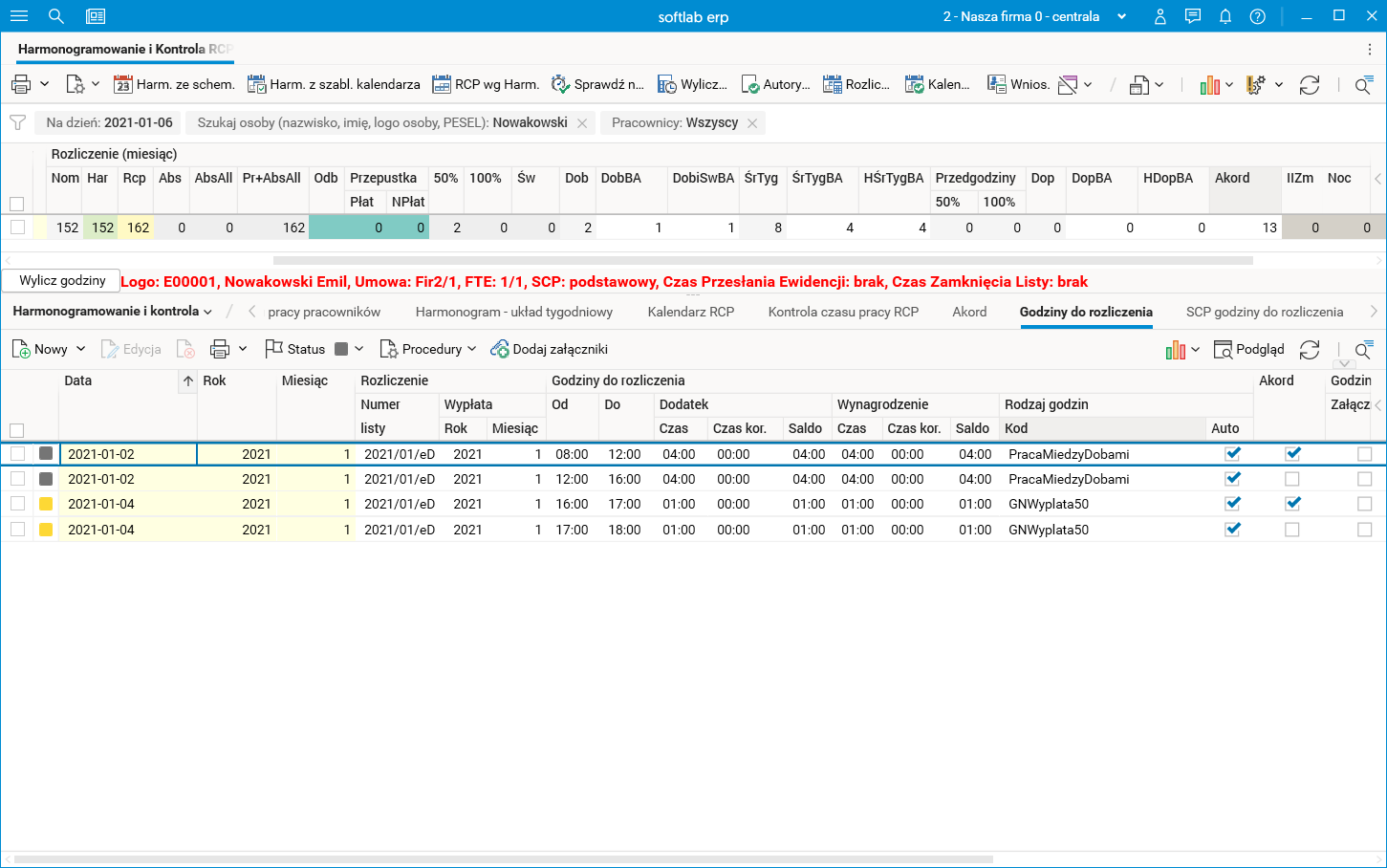 Rys. Słownik Harmonogramowanie i Kontrola RCP – wyliczone sumy w zakładce Rozliczenie (okres)