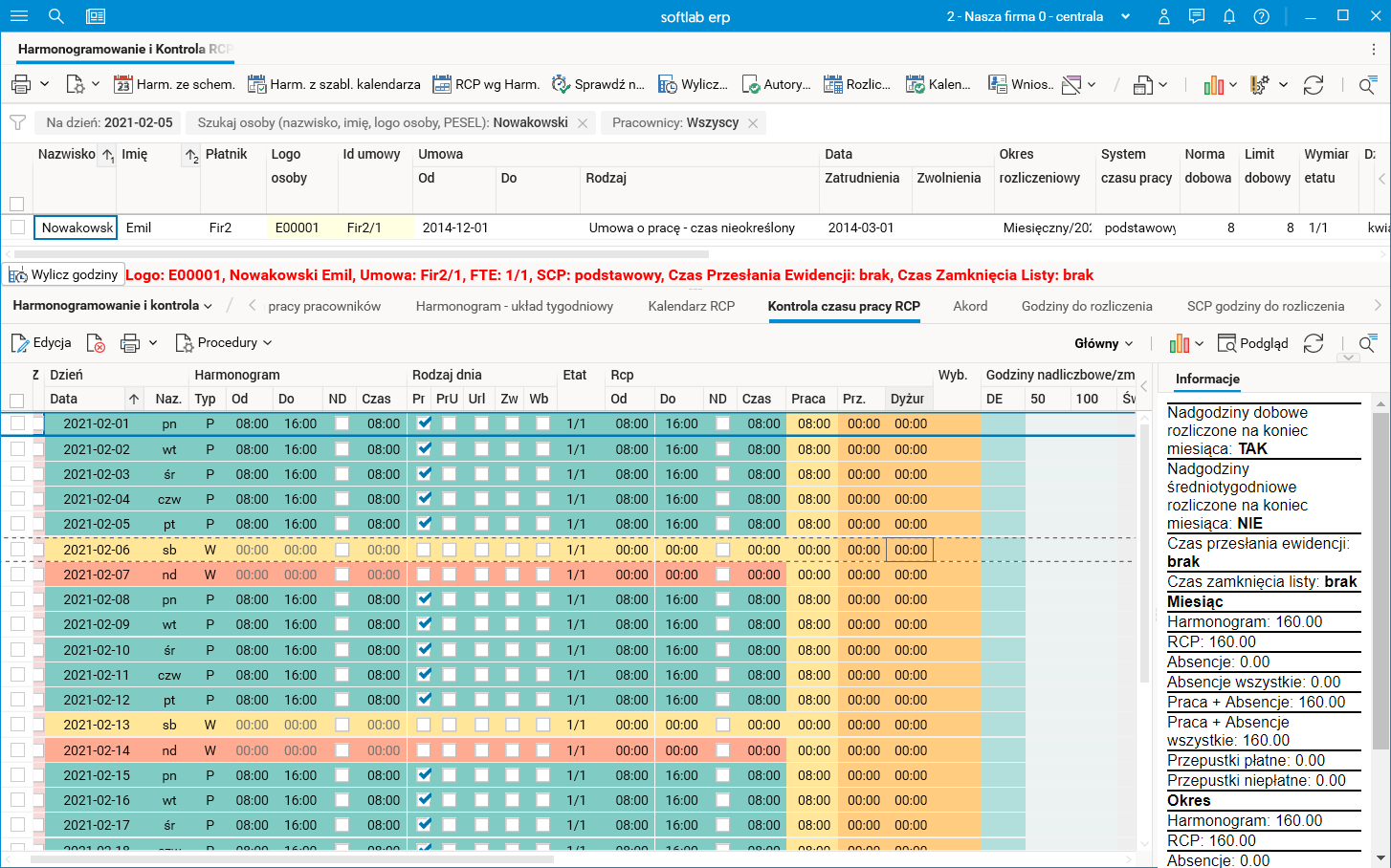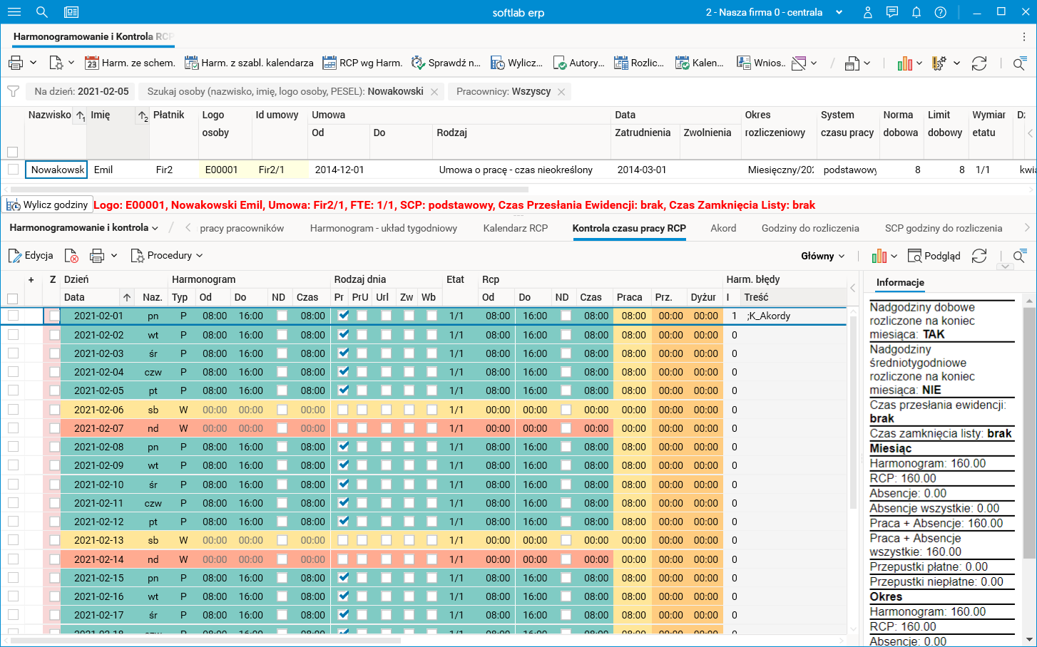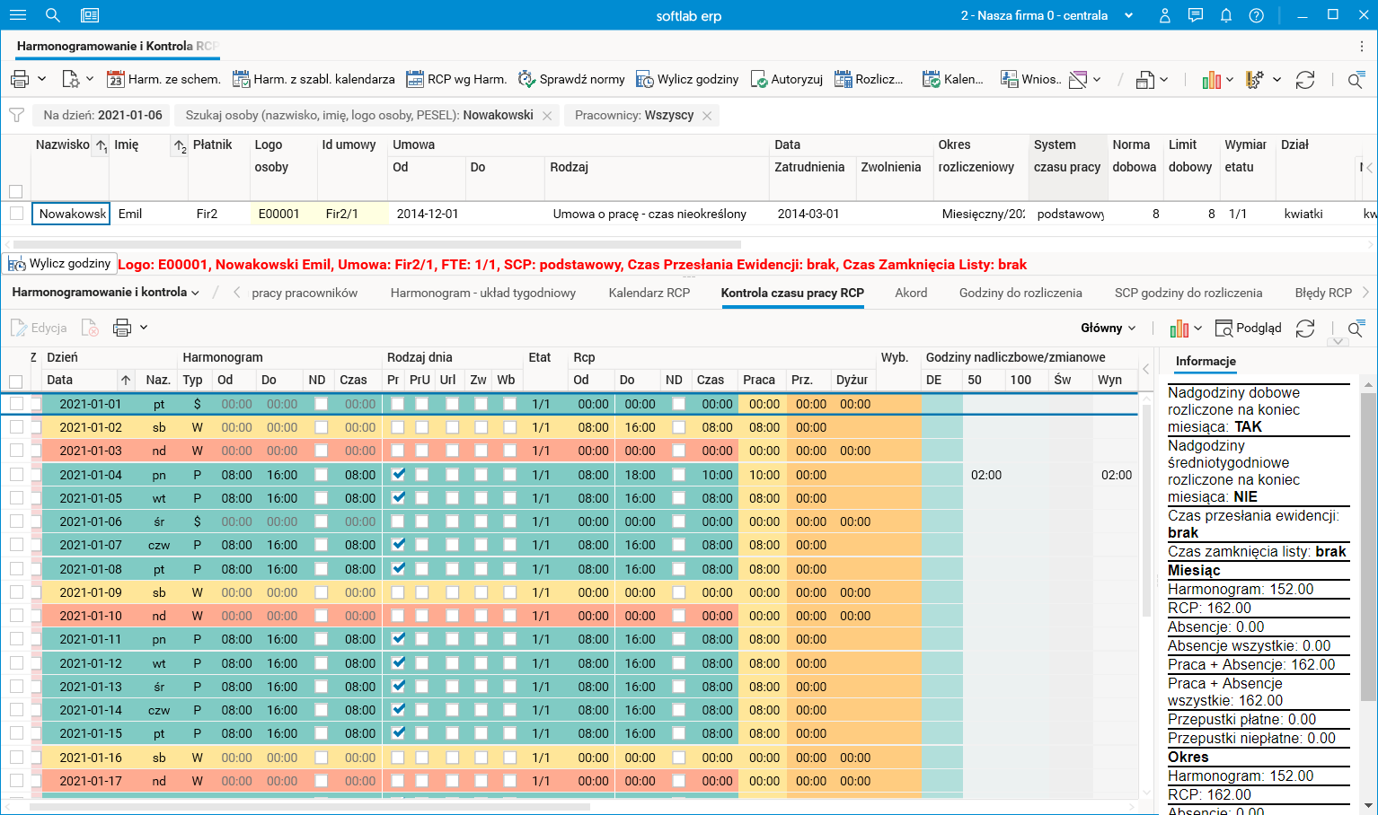 Rys. Słownik Harmonogramowanie i Kontrola RCP – wyliczone sumy w zakładce Rozliczenie (okres)
