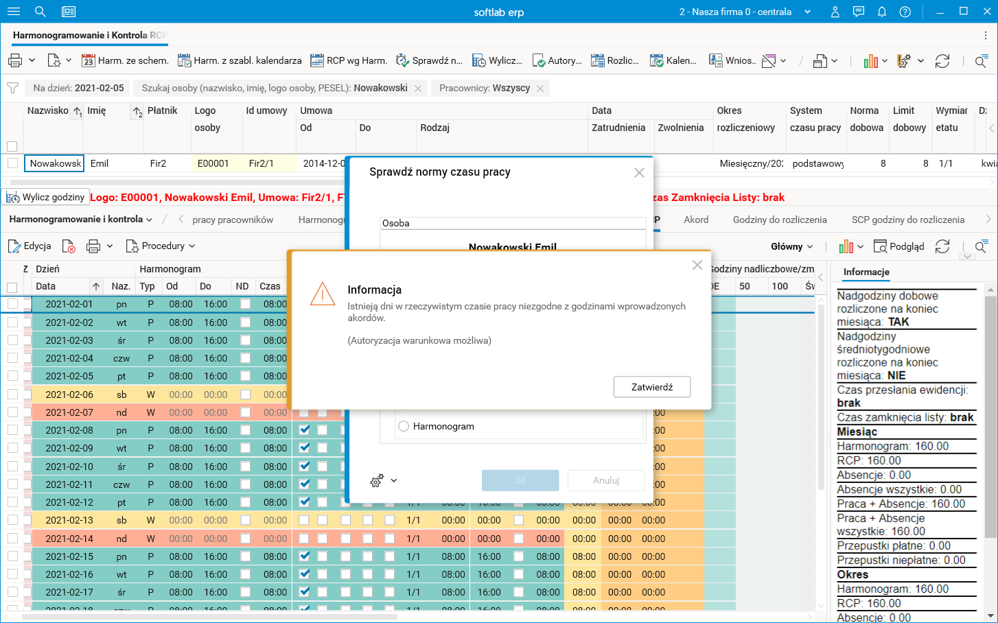 · sprawdzania norm czasu pracy (błąd ogólny K_Akordy_O i błędy szczegółowe rejestrowane w konkretnych dniach K_Akordy – domyślnie skonfigurowane jako błędy typu informacja)