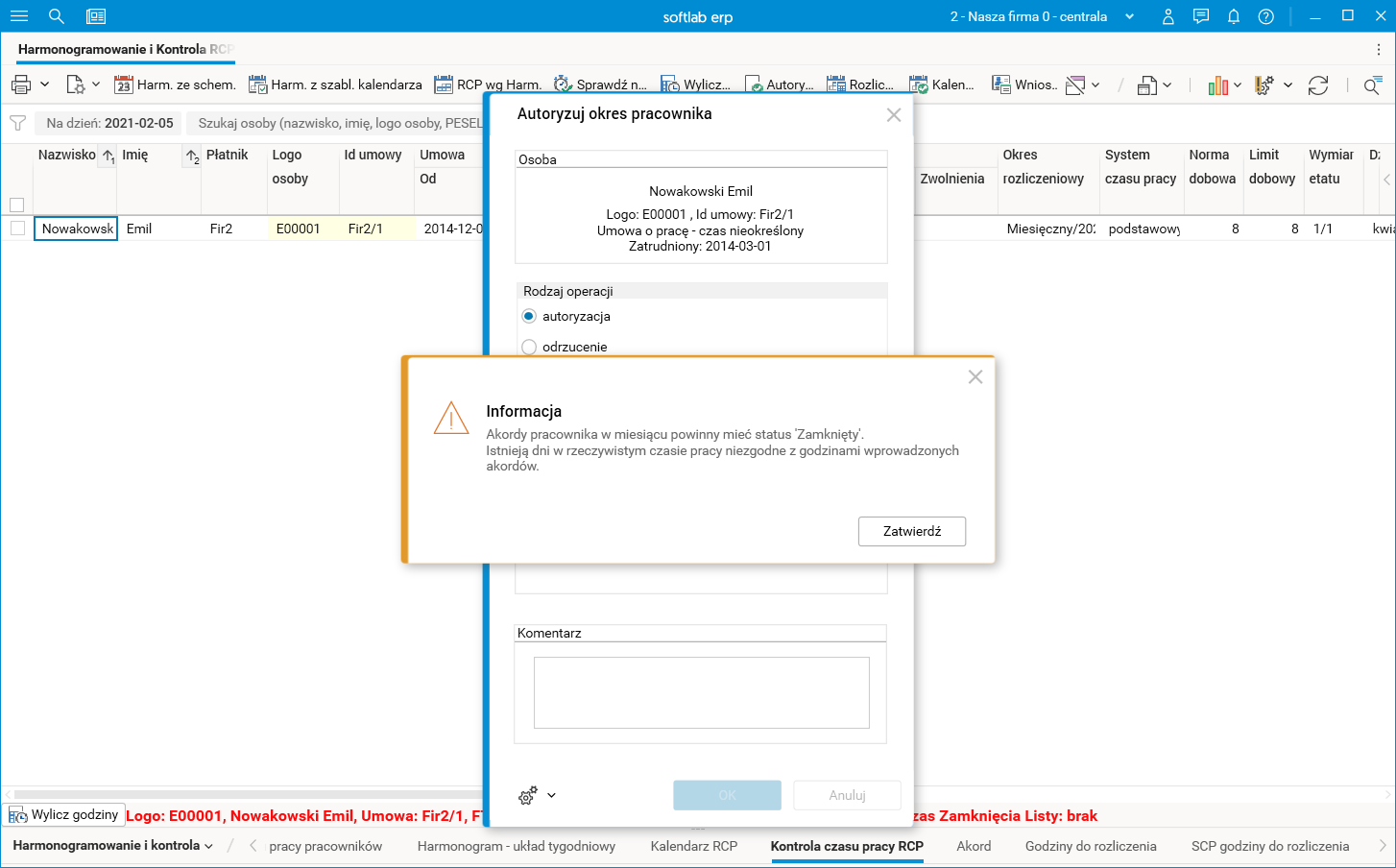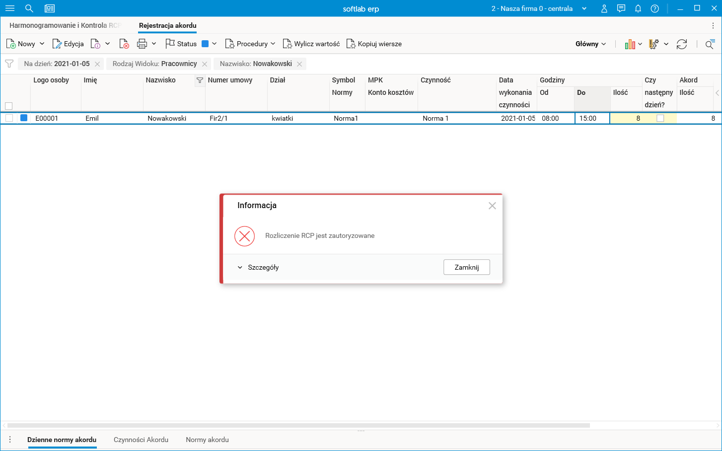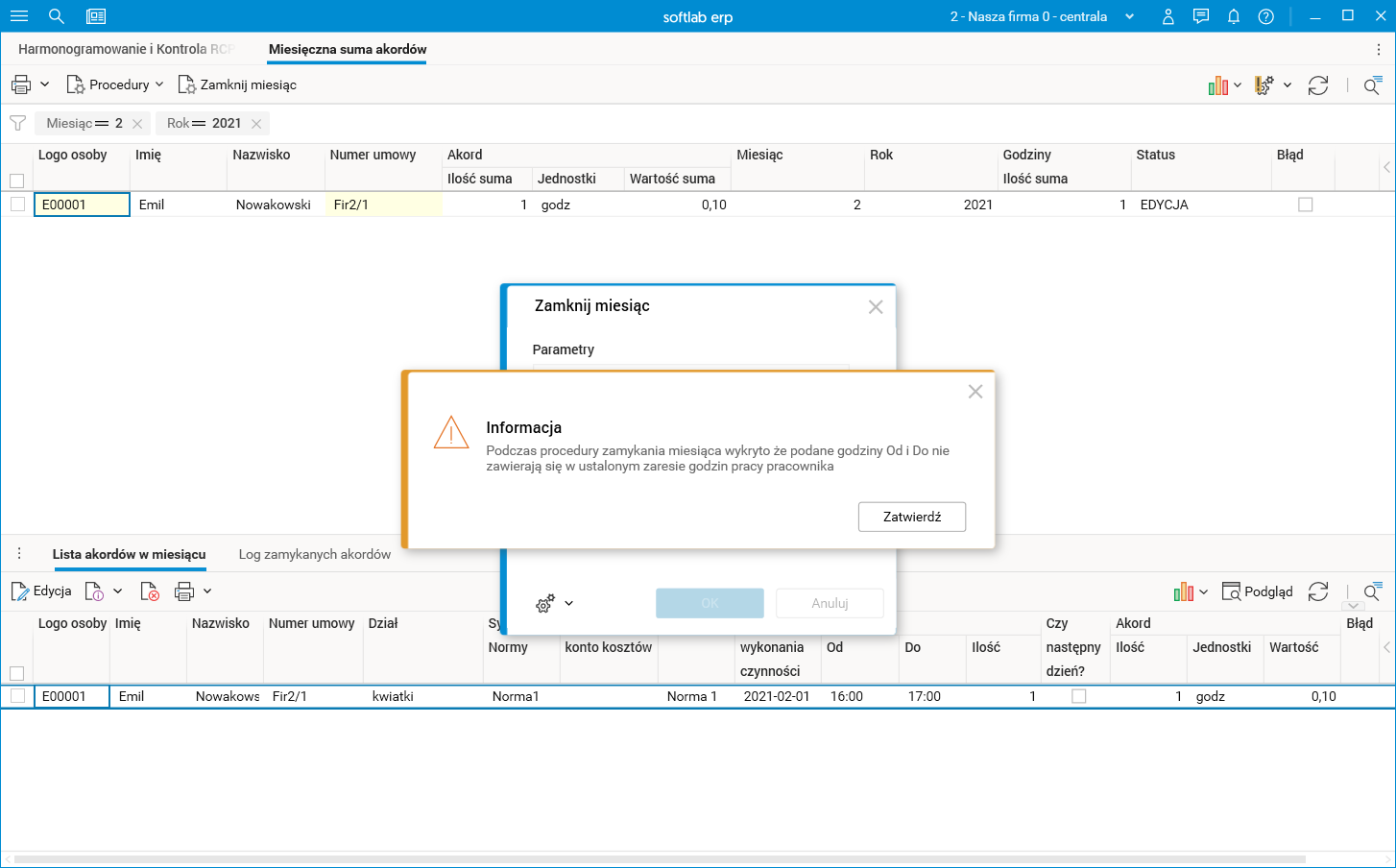 W module Akord również wprowadzono kontrole pod kątem zgodności pracy zarejestrowanej w akordzie z pracą wprowadzoną w module RCP (praca w akordzie powinna zawierać się w godzinach pracy pracownika).