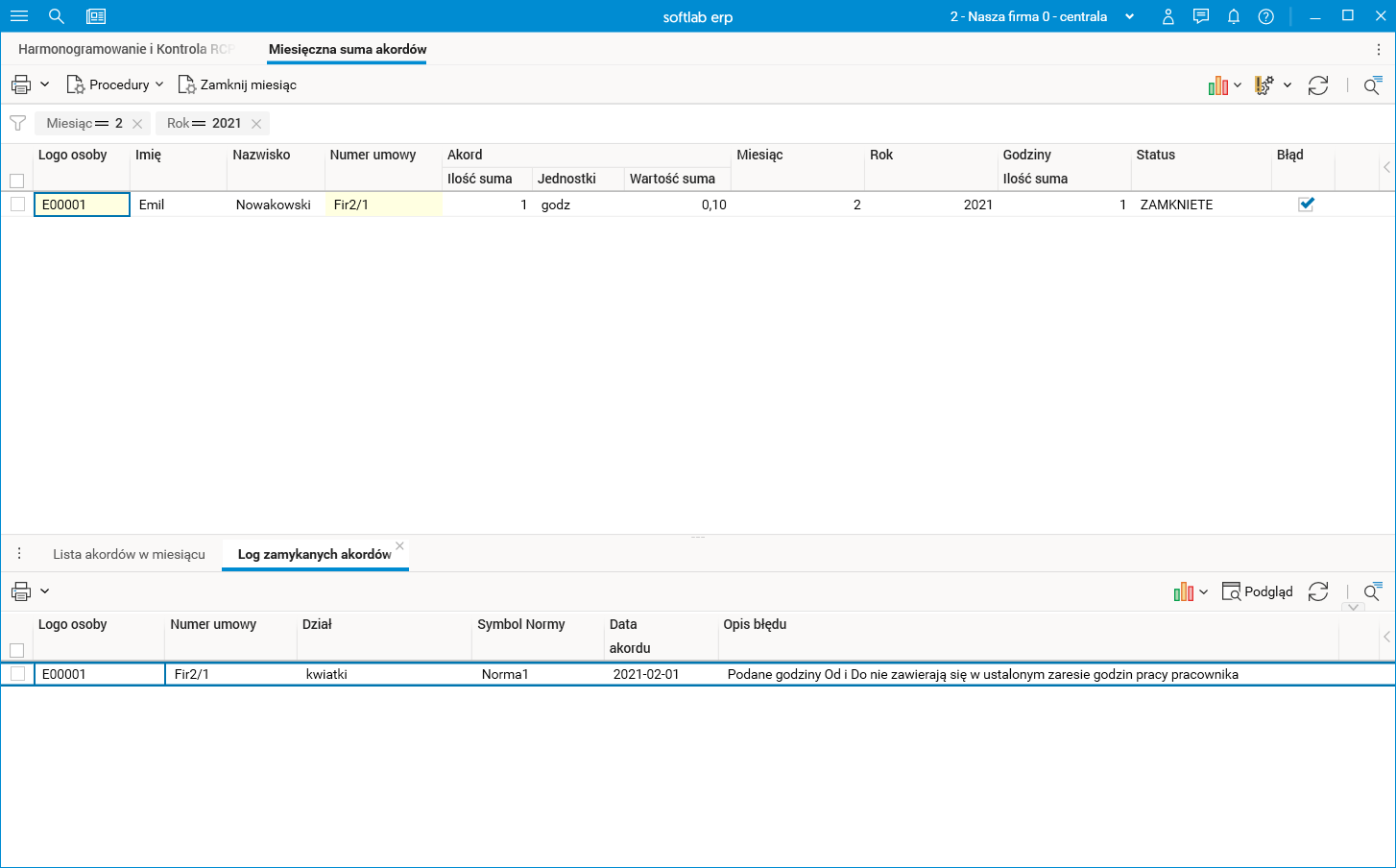 Rys. Moduł Akord – słownik Miesięczna suma akordów, log błędu podczas zamykania miesiąca, gdy zarejestrowane akordy są niezgodne z czasem pracy w module RCP