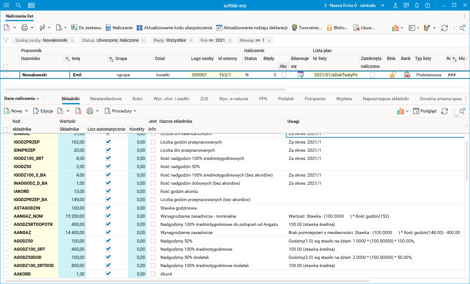 Na zrzucie poniżej przedstawiono przykładowe naliczenie listy płac dla pracownika.
