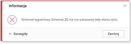 Procedura wymaga, aby wskazany w parametrach procedury schemat tygodnia miał określoną datę startu cyklu. Gdy wskazany zostanie schemat, który nie ma wskazanej tej daty, pojawi się komunikat.
