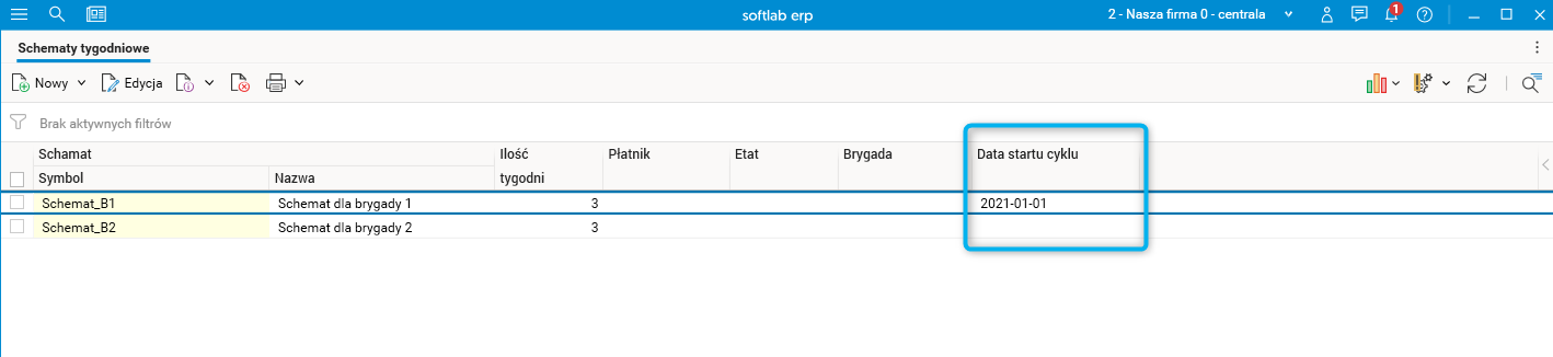 Datę startu cyklu określa się przy tworzeniu schematu tygodniowego w słowniku Schematy tygodniowe.