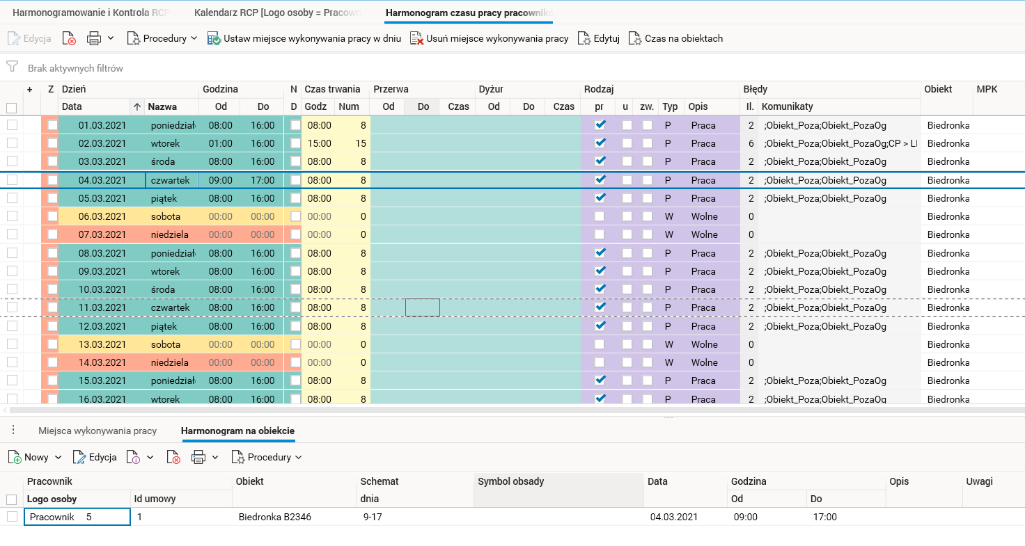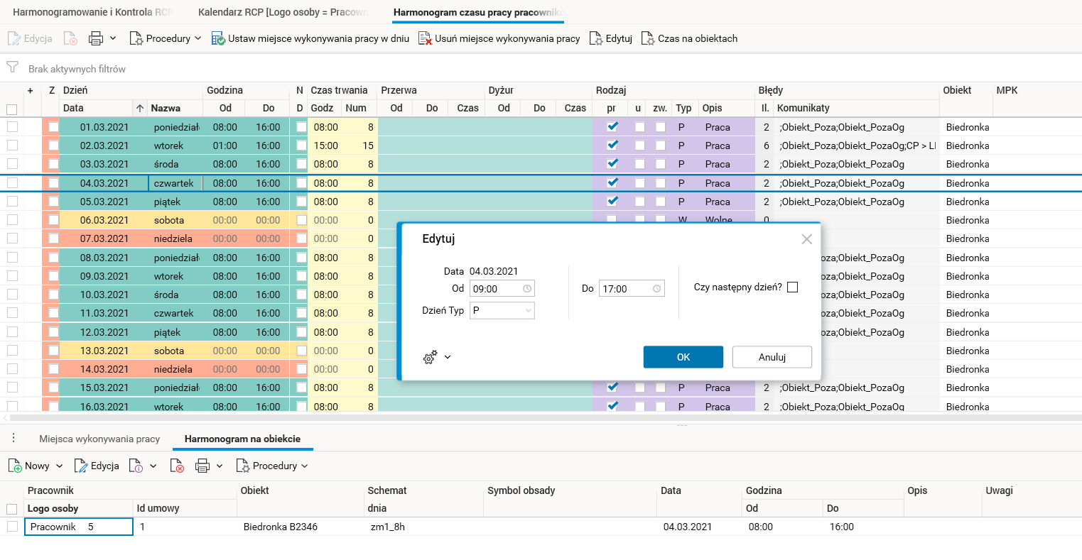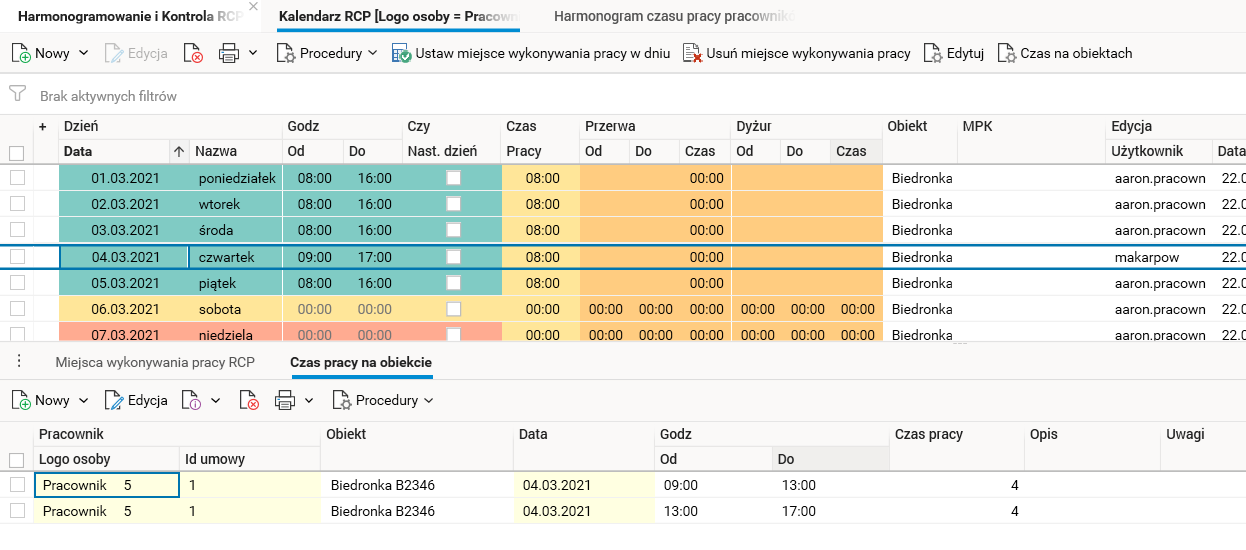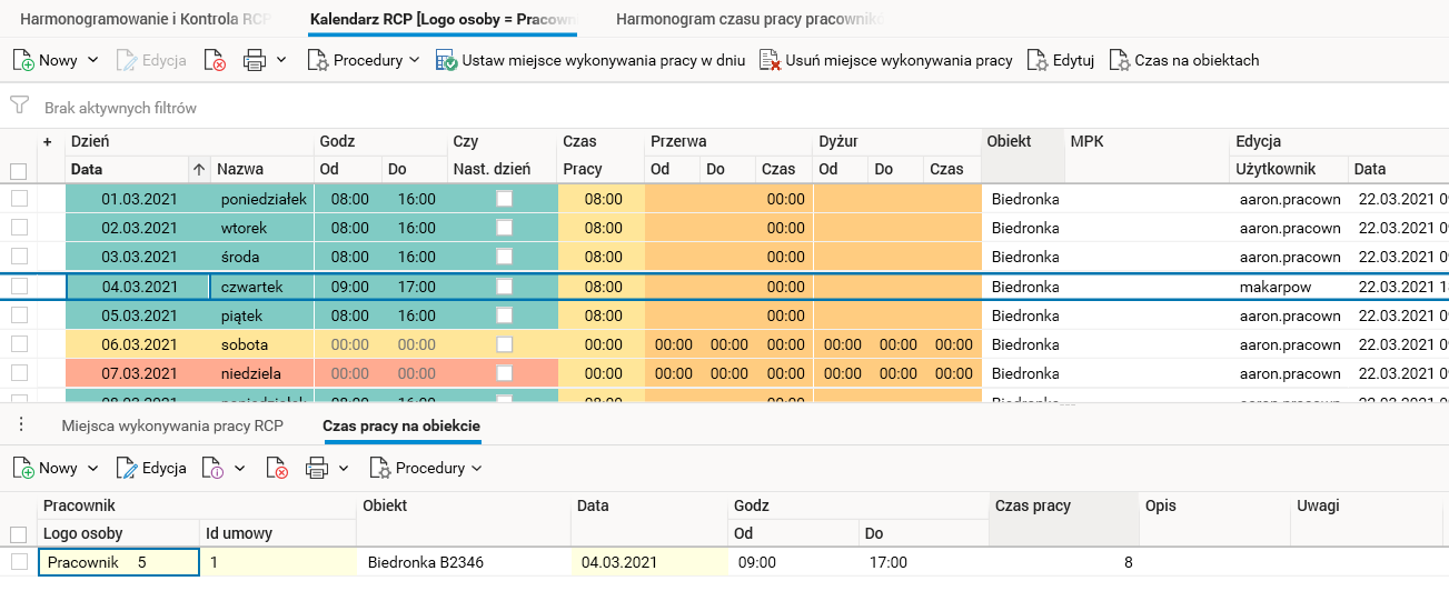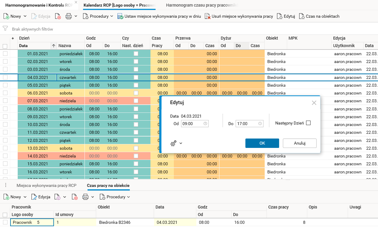 Ponieważ harmonogram czasu pracy pracownika i jego kalendarz RCP są często wykorzystywane do przeglądania i edycji czasu pracy, w obu słownikach dodano procedury do edycji czasu pracy w obiektach, które modyfikują bezpośrednio czas pracy w obiektach, a następnie przenoszą te modyfikacje do obu słowników.