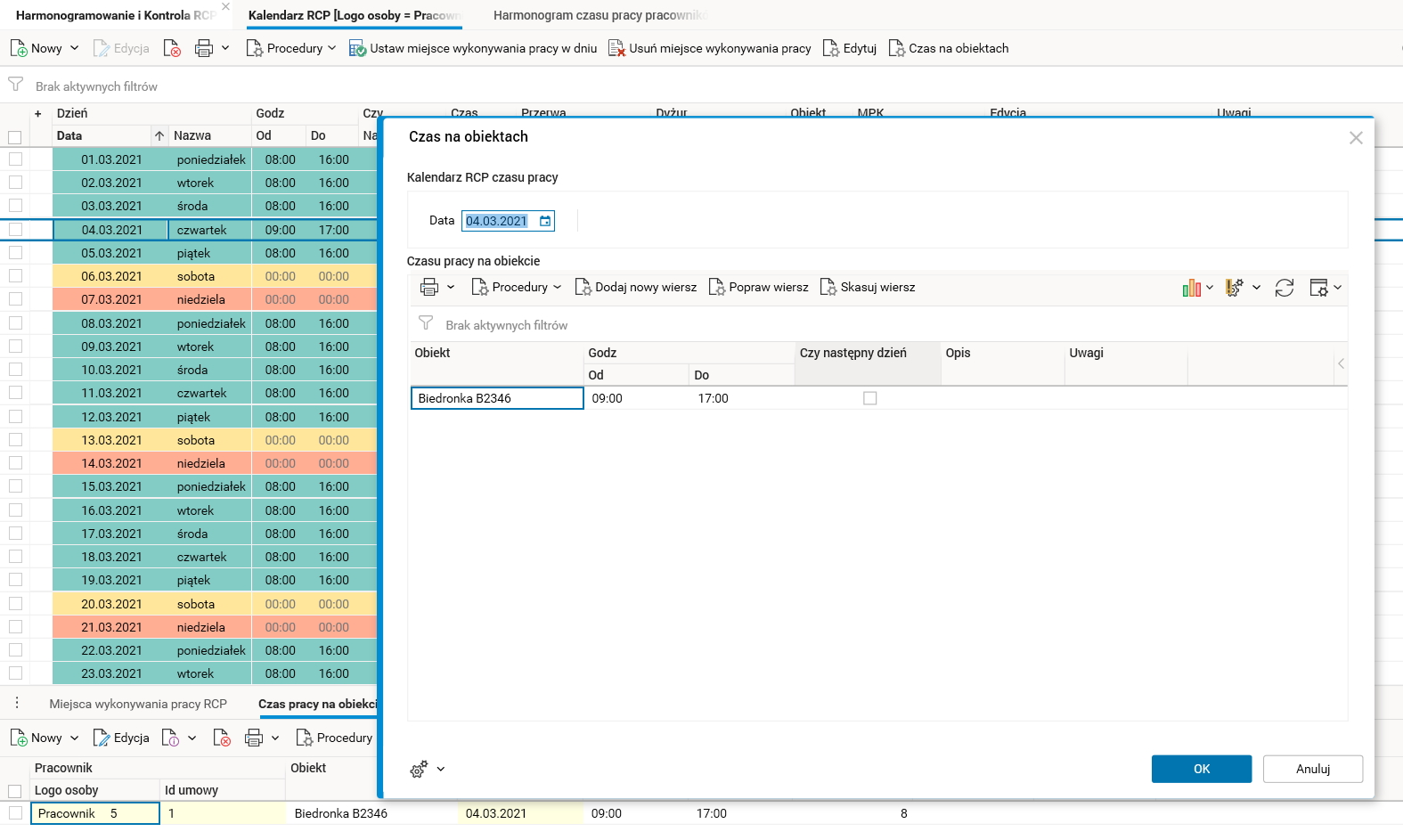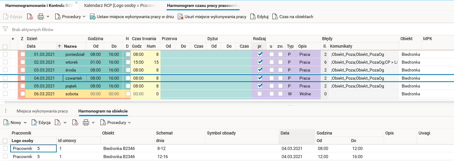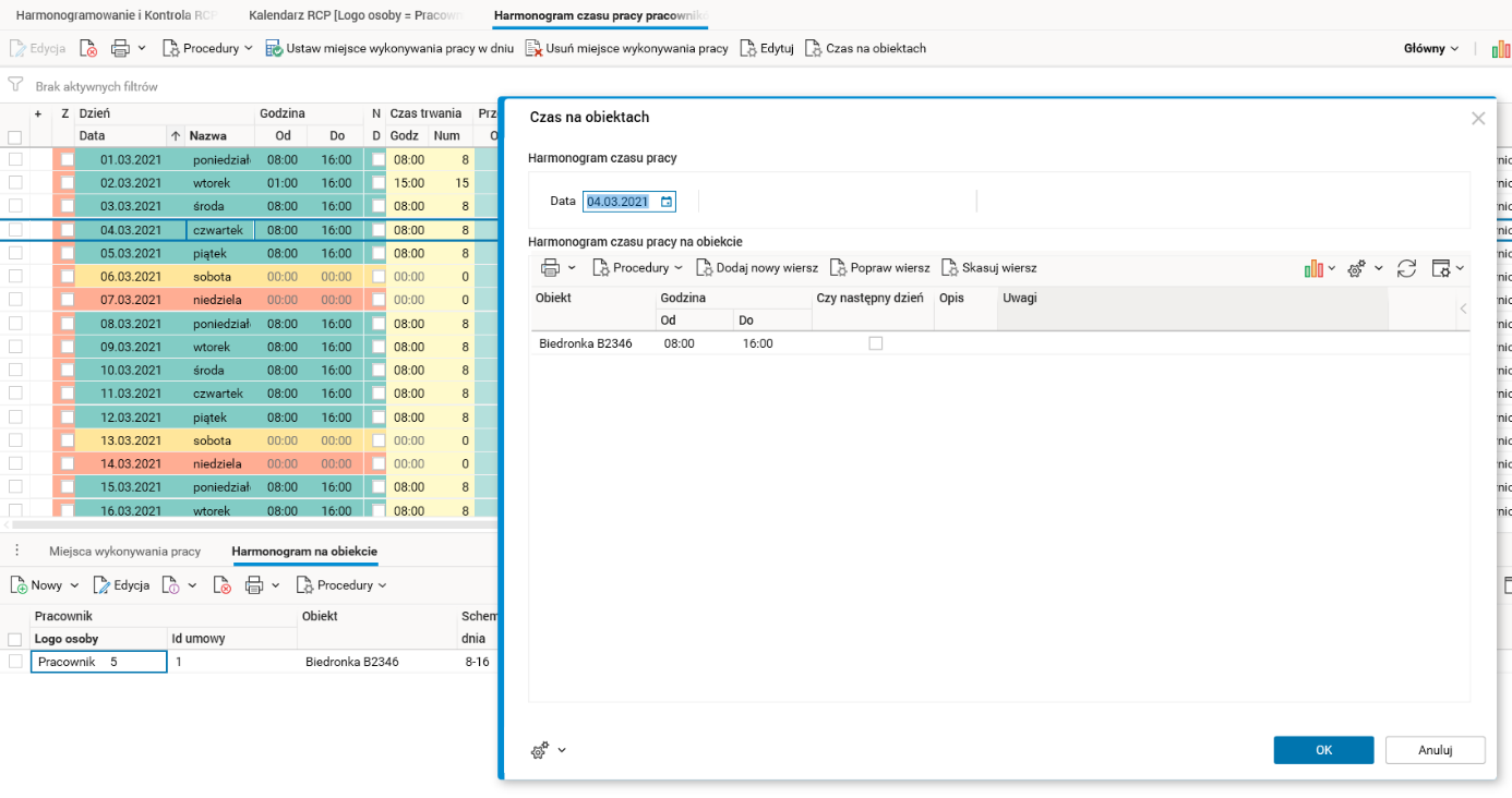 Jeżeli wszystkie warunki są spełnione, czas pracy wpisany w procedurze Czas na obiektach zostanie zapisany w szczególe Harmonogram na obiekcie, a suma godzin zostanie przepisana do głównego harmonogramu pracownika w słowniku Harmonogram czasu pracy pracownika, dostępnym jako szczegół słownika Harmonogramowanie i Kontrola RCP.