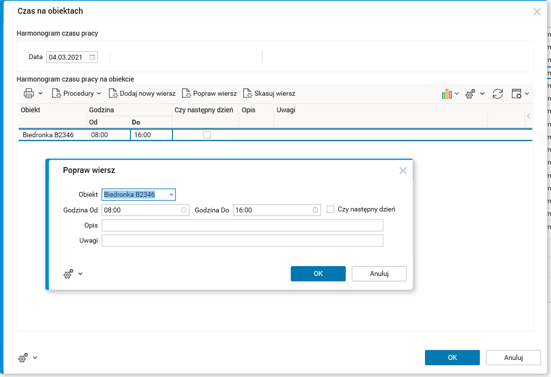 Akcja Popraw wiersz pozwala na poprawę istniejącego wpisu widocznego w oknie procedury Czas na obiektach.