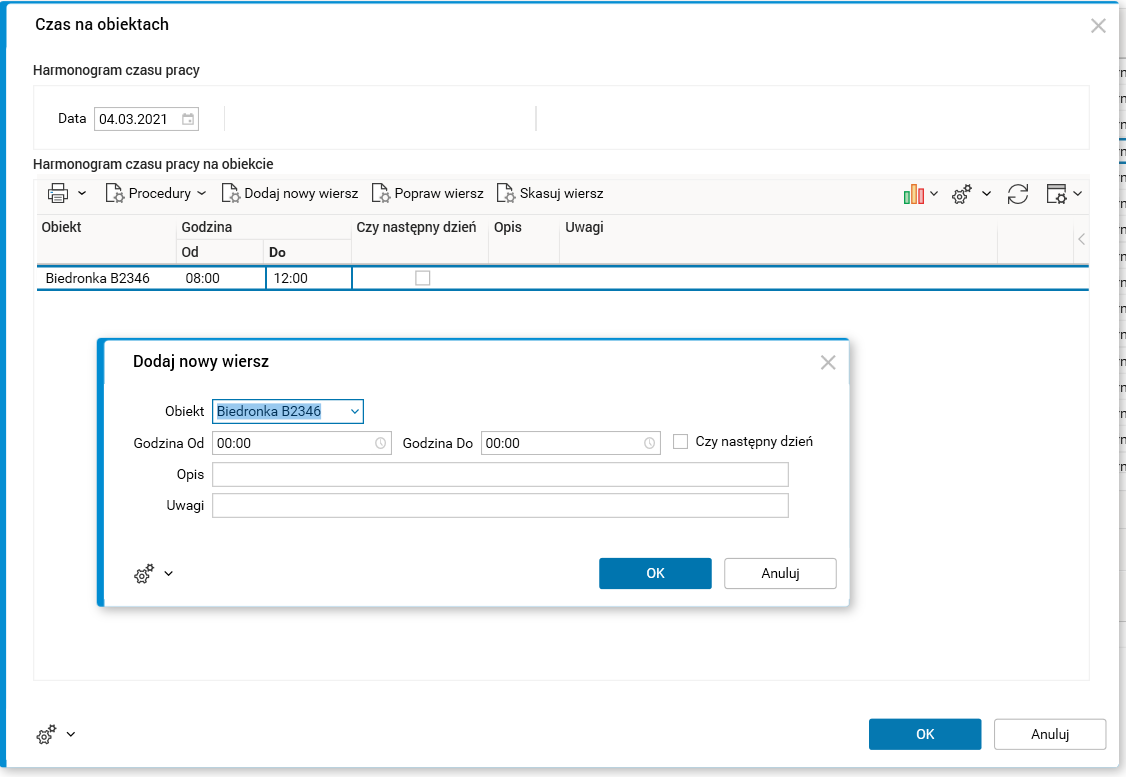 Procedura Czas na obiektach umożliwia dodawanie/edytowanie/kasowanie zaplanowanego czasu pracy pracownika na wielu obiektach w danym dniu.