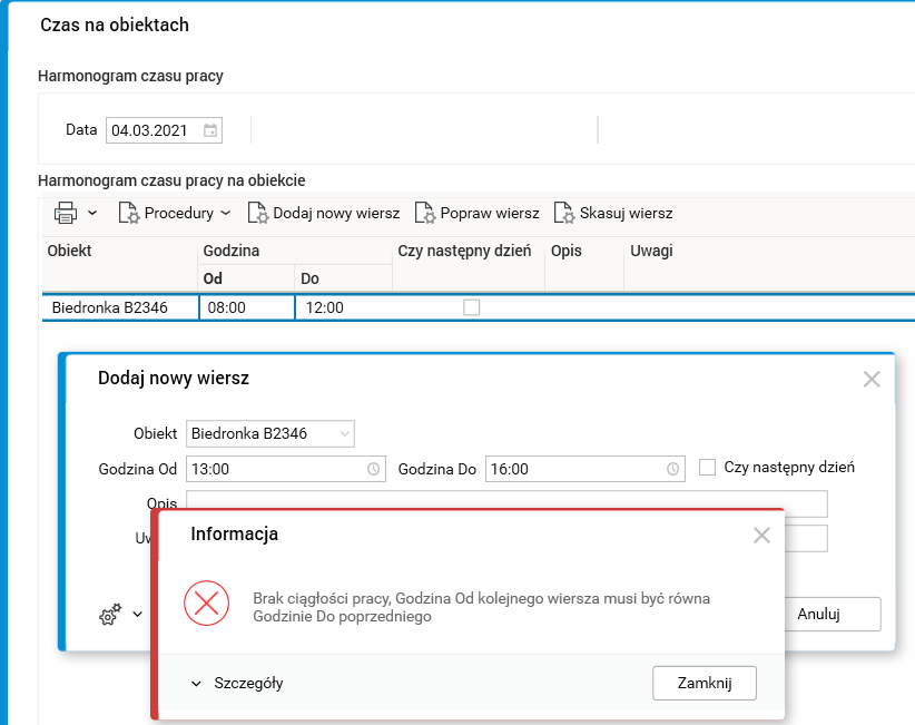 Rys. 53. Walidacja ciągłości godzin pracy w akcji Dodaj nowy wiersz