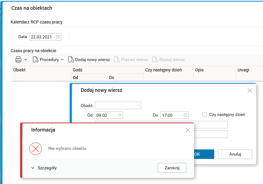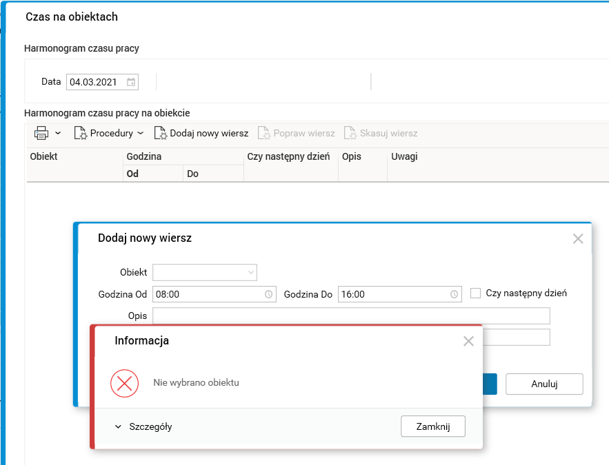Dodatkowo akcje te sprawdzają, czy dodano obiekt do czasu pracy na obiekcie.
