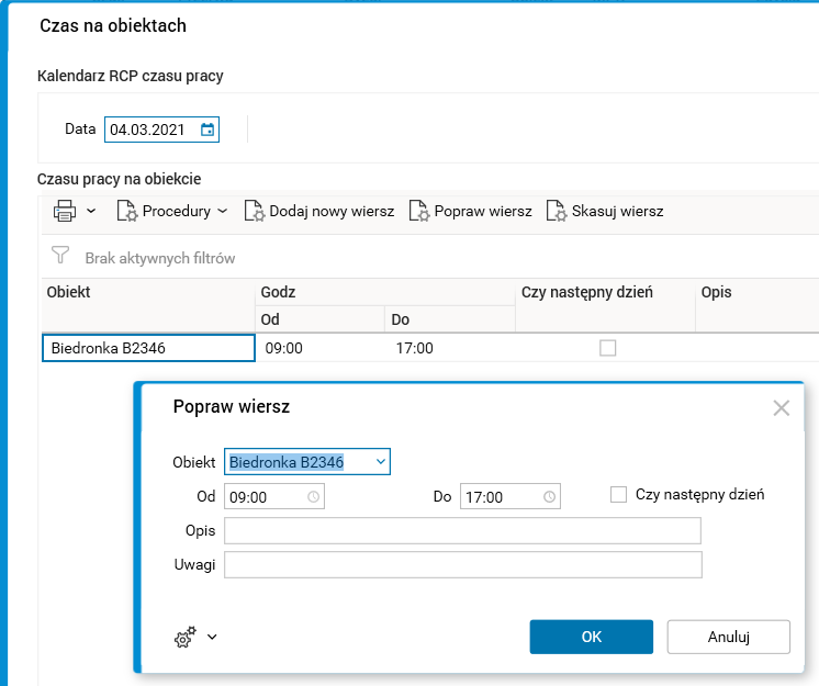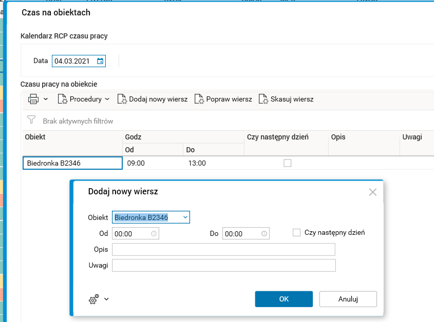 Procedura Czas na obiektach pozwala na dodawanie/edytowanie/kasowanie czasu pracy pracownika na wielu obiektach w danym dniu.