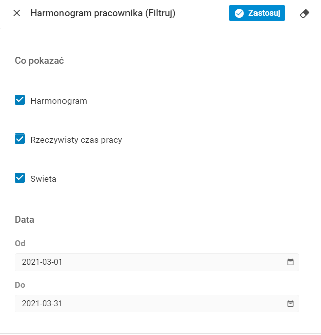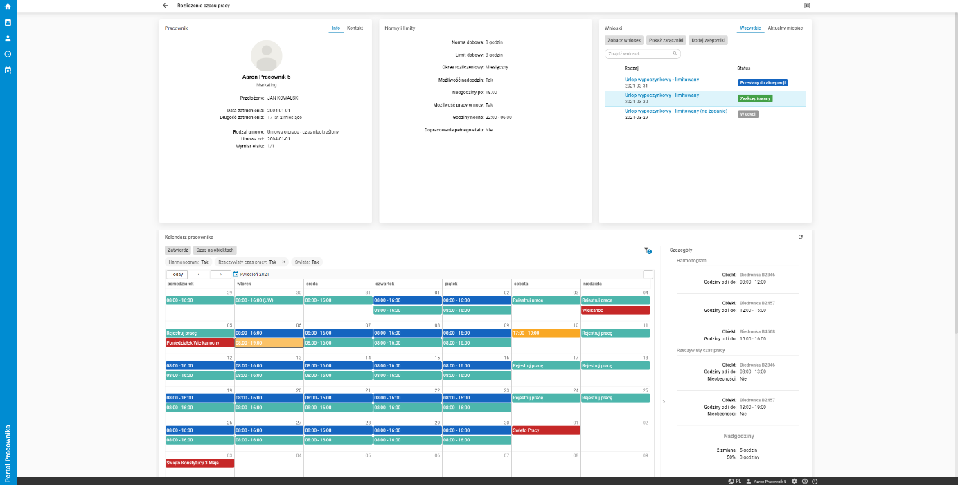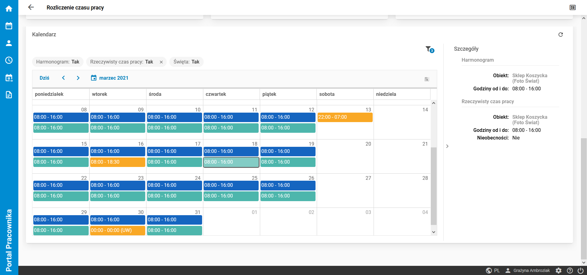 Na niebiesko pokazywane są godziny z harmonogramu pracownika, a na zielono rzeczywisty czas pracy. W przypadku gdy rzeczywisty czas pracy odbiega od harmonogramu, kolor rzeczywistych godzin pracy zmieni się na pomarańczowy.
