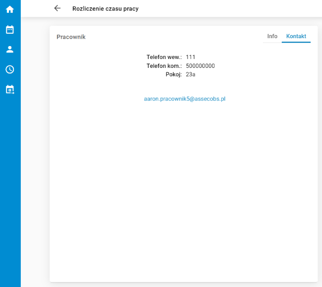 Sekcja Pracownik przedstawia podstawowe informacje o zalogowanym pracowniku i składa się z 2 widoków. W widoku Info znajdują się informacje o zatrudnieniu pracownika: stanowisko, miejsce pracy, długość zatrudnienia, a także dane o umowie. W widoku Kontakt znajdują się dane kontaktowe pracownika.