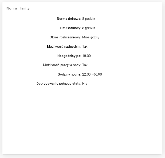 W sekcji Normy i limity znajdują się podstawowe parametry związane z normatywnym czasem pracy pracownika, m.in.: możliwość nadgodzin, zakres godzin nocnych, norma dobowa oraz dobowy limit czasu pracy. Są one pobierane bezpośrednio ze szczegółu Informacje do umowy, który znajduje się w słowniku Kadry ® Kartoteki ® Kartoteki pracowników ® Pracownicy Umowy(etaty), grupa szczegółów Dane kadrowe ® Informacje do umowy.