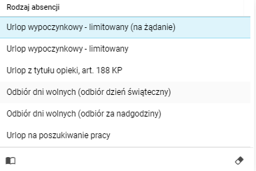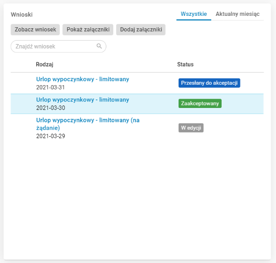 W sekcji Wnioski pracownik może przeglądać zarejestrowane wnioski urlopowe oraz składać nowe.