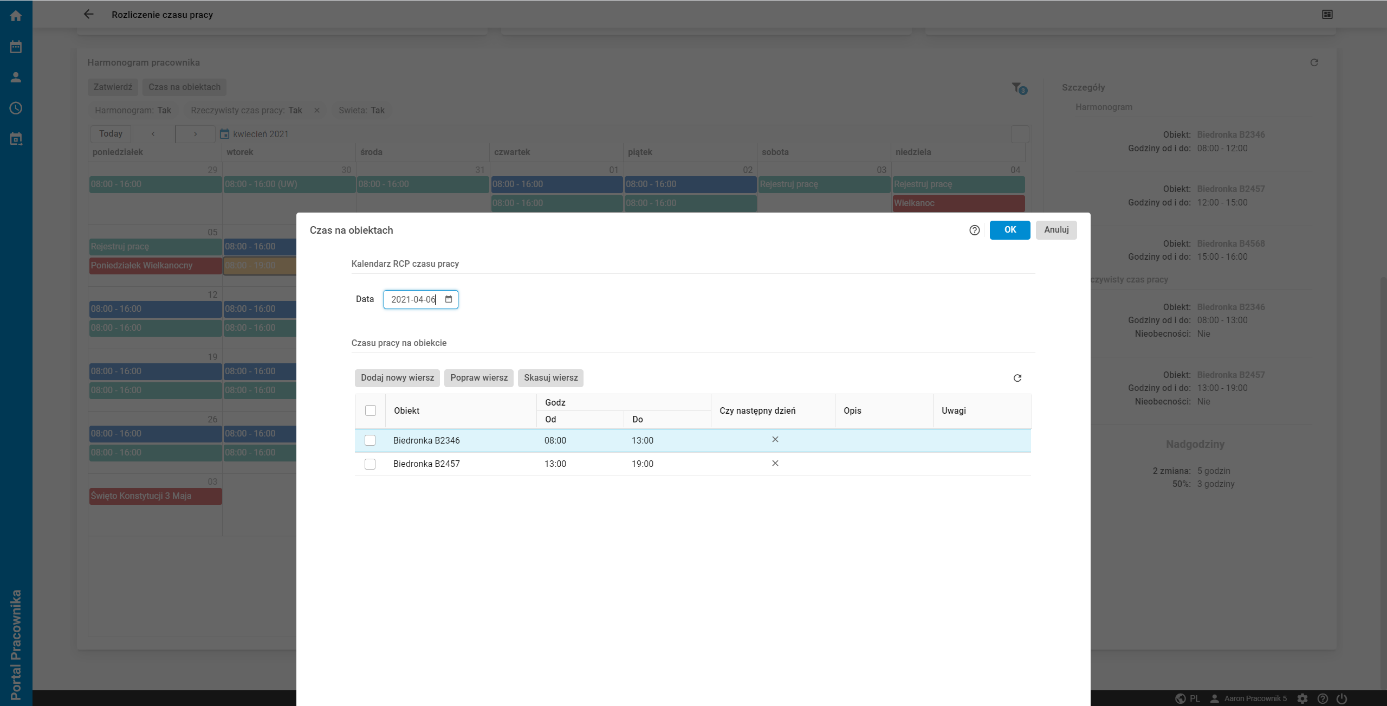 · godziny pracy i obiekt, na jakim pracownik powinien pracować według harmonogramu,
