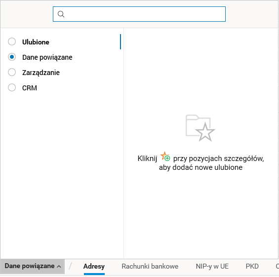 Jeżeli grupa Ulubione jest pusta, to po wybraniu jej w menu szczegółów wyświetli się informacja o możliwości dodania szczegółów do ulubionych.