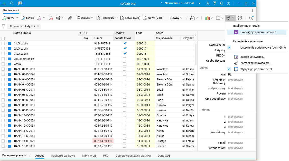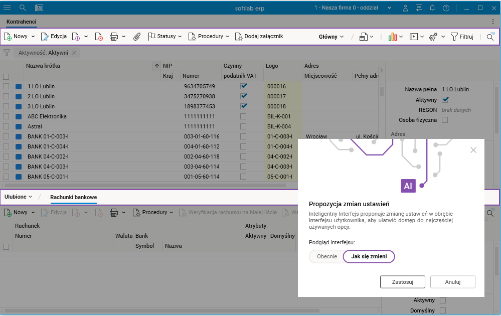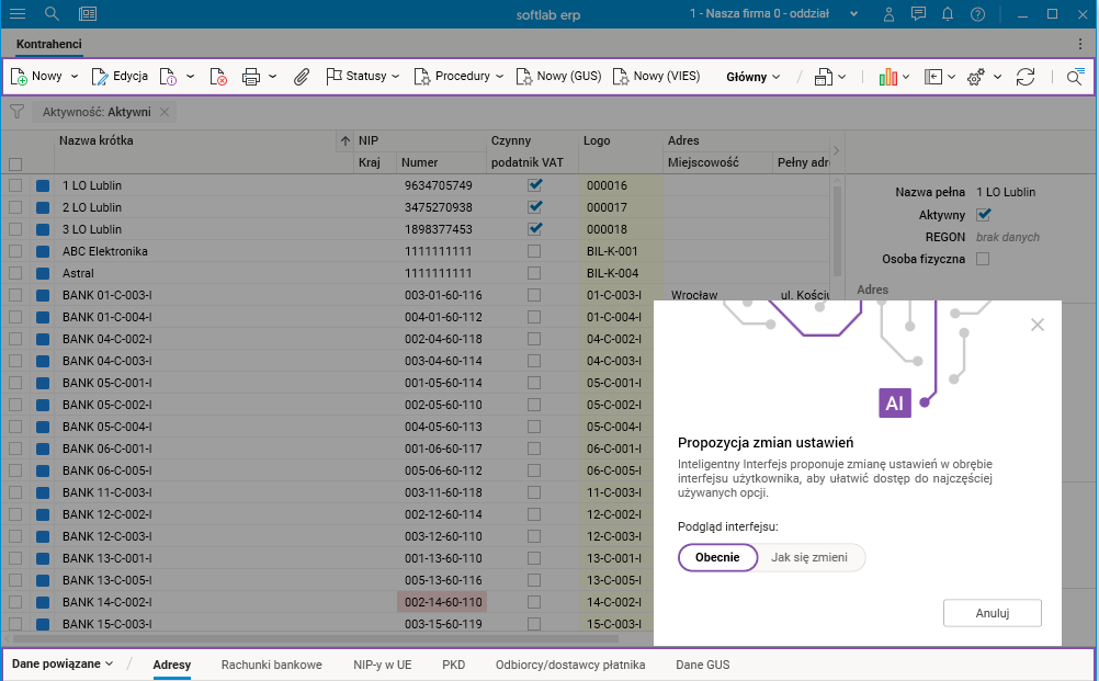 Większość użytkowników wykorzystuje tylko niektóre z dostępnych funkcjonalności. Nie zawsze są to funkcjonalności, które domyślnie ustawione są jako główne, np. wyciągnięte procedury na pasek akcji. Opisywany mechanizm aktualnie automatycznie dostosowuje ustawienia procedur i szczegółów dla 10 najczęściej używanych przez użytkownika słowników.