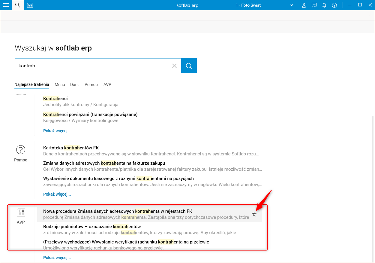 Podczas wyszukiwania w głównej wyszukiwarce aplikacji pojawi się dodatkowa sekcja oznaczona jako AVP z odnośnikami do artykułów. Po umieszczeniu kursora na tytule artykułu po jego prawej stronie pojawi się przycisk z symbolem gwiazdki, umożliwiający dodanie artykułu do ulubionych lub usunięcie go z nich.