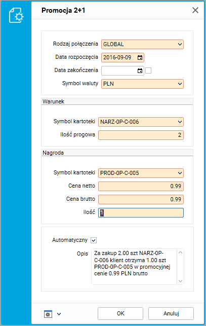 • Promocja typu 2+1. Obejmuje ona określenie indeksów materiałowych oraz ilości progowych dla zdefiniowanych warunków oraz określenie indeksu materiałowego będącego nagrodą (wraz z jego ceną i ilością).