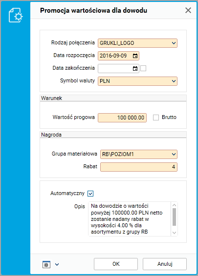 • Promocja wartościowa dla dowodu. Obejmuje ona określenie progu wartościowego dowodu, po przekroczeniu którego zostanie udzielony rabat dla wybranej grupy materiałowej.