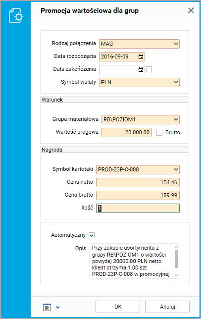• Promocja wartościowa dla grup. Obejmuje ona określenie grupy materiałowej i progu wartościowego oraz indeksu materiałowego będącego nagrodą. W tym przypadku warunkiem zaistnienia promocji (na dowodzie) jest osiągnięcie przez indeksy, należące do wybranej grupy, progu wartościowego.