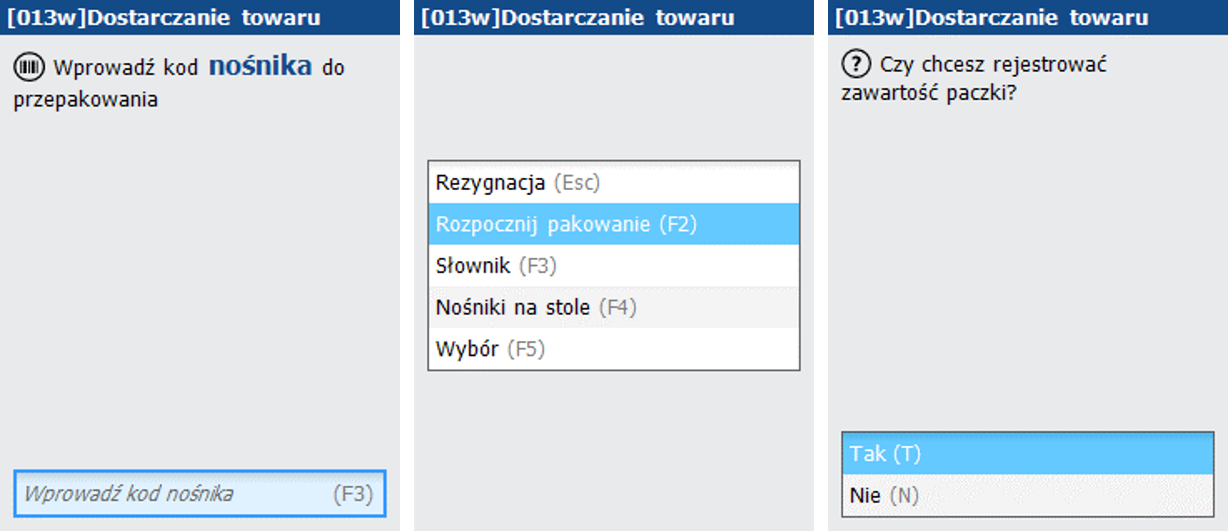 W związku z powyższymi zmianami w procesie Dostarczanie towaru do menu ekranu wprowadzania nośnika przepakowania została dodana opcja Rozpocznij pakowanie (F2), pozwalająca przejść bezpośrednio do procesu pakowania, np. po dostarczeniu towaru z wybranych nośników.